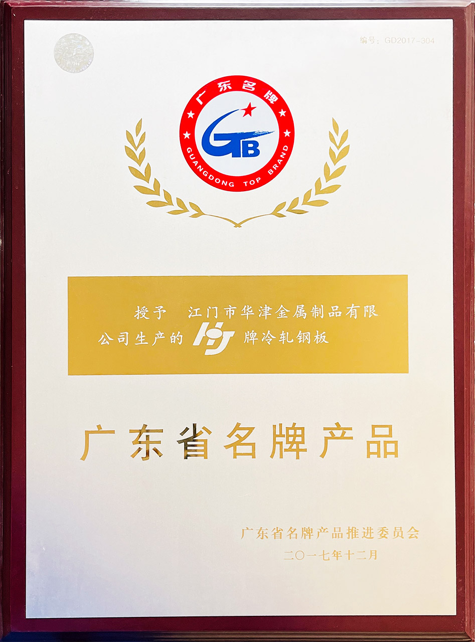 授予 江門市華津金屬制品有限公司 生產的HJ牌冷軋鋼板