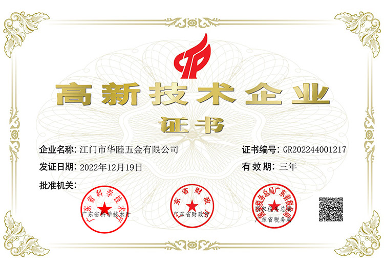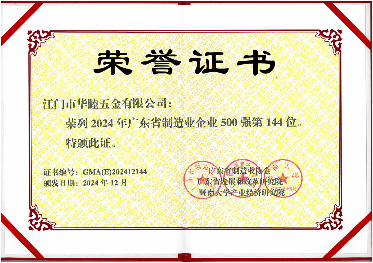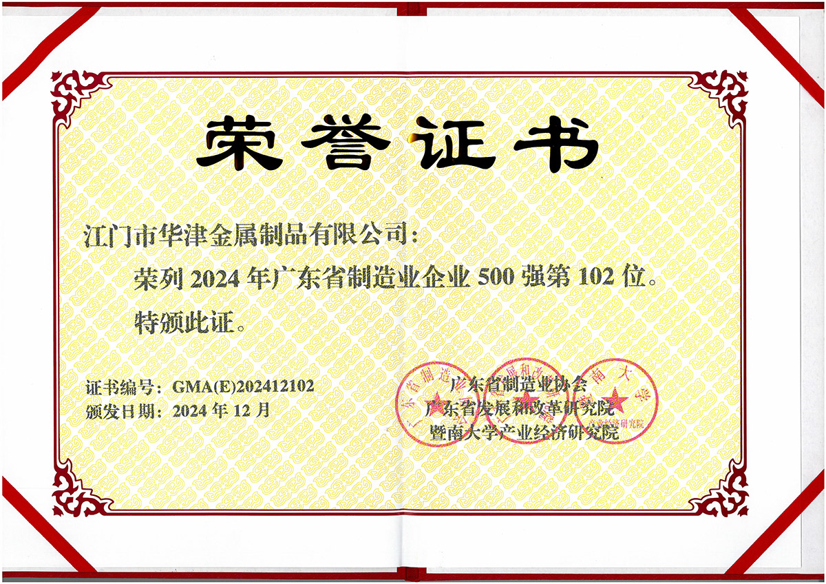 集團創建以來,社會各界對華津的企業發展給予了充分的肯定和高度的評價。華津榮列2024年廣東省制造業企業500強第102位,華睦榮列2024年廣東省制造業企業500強144位,并且先后榮獲:國家高新技術企業、廣東省工程技術研究中心、廣東省名牌產品、江門市工程技術研究中心、標準化工作AAA級企業、江門企業百強等稱號。
