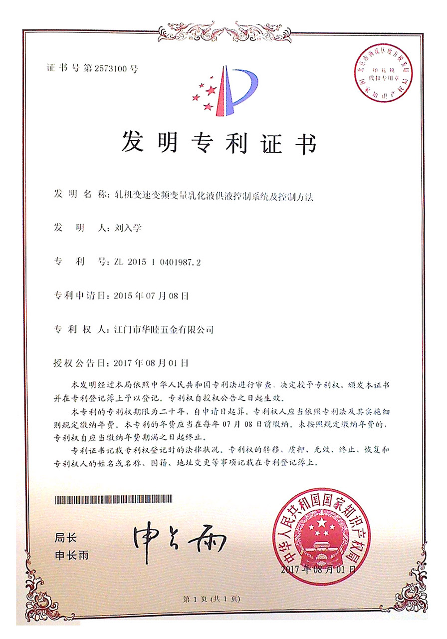 授予 江門市華睦五金有限公司 生產的"華睦"牌冷軋鋼板